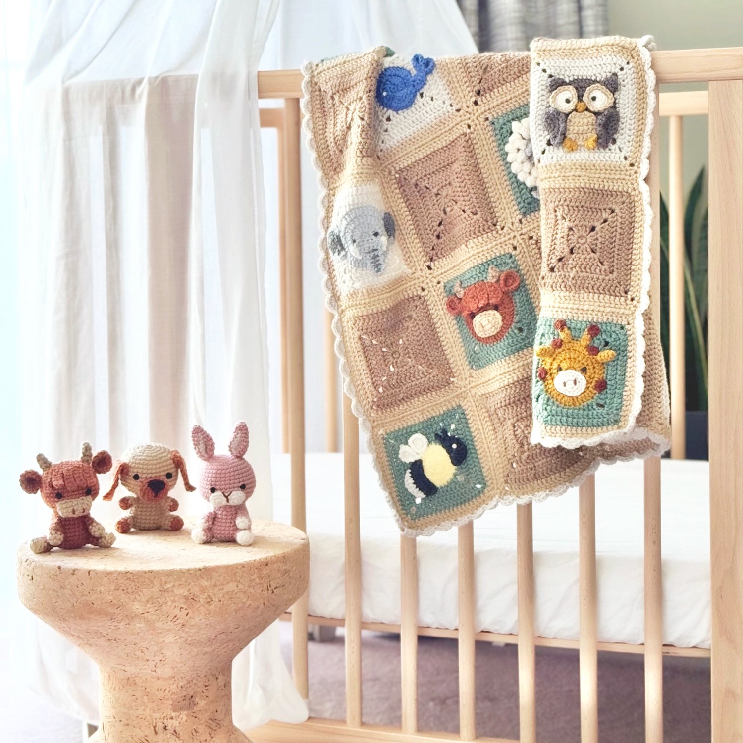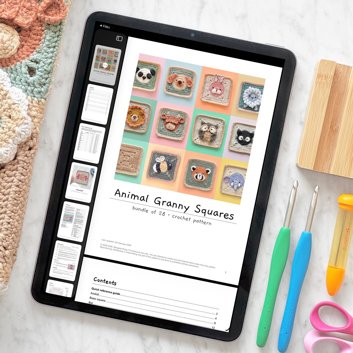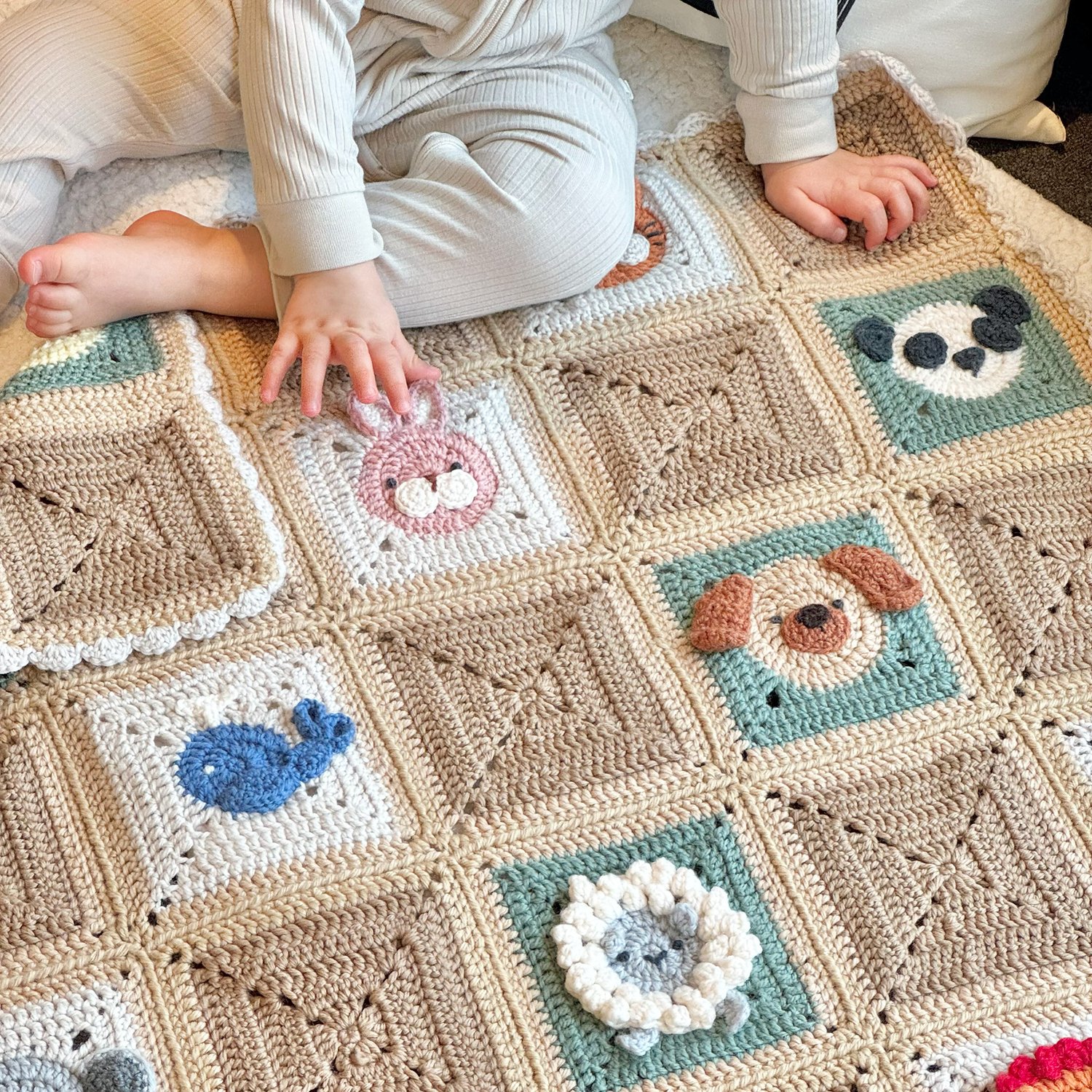 This bundle includes 28 patterns for crocheting animal granny squares: Axolotl, Bat, Bear, Bumble Bee, Cat, Dog, Donkey, Duck, Elephant, Frog, Giraffe, Highland Cow, Koala, Lion, Monkey, Octopus, Owl, Panda, Penguin, Pig, Rabbit, Red Panda, Sheep, Sloth, Tiger, Unicorn, Whale, and the Basic square. Perfect for cozy blankets, cushions, and baby sensory items.